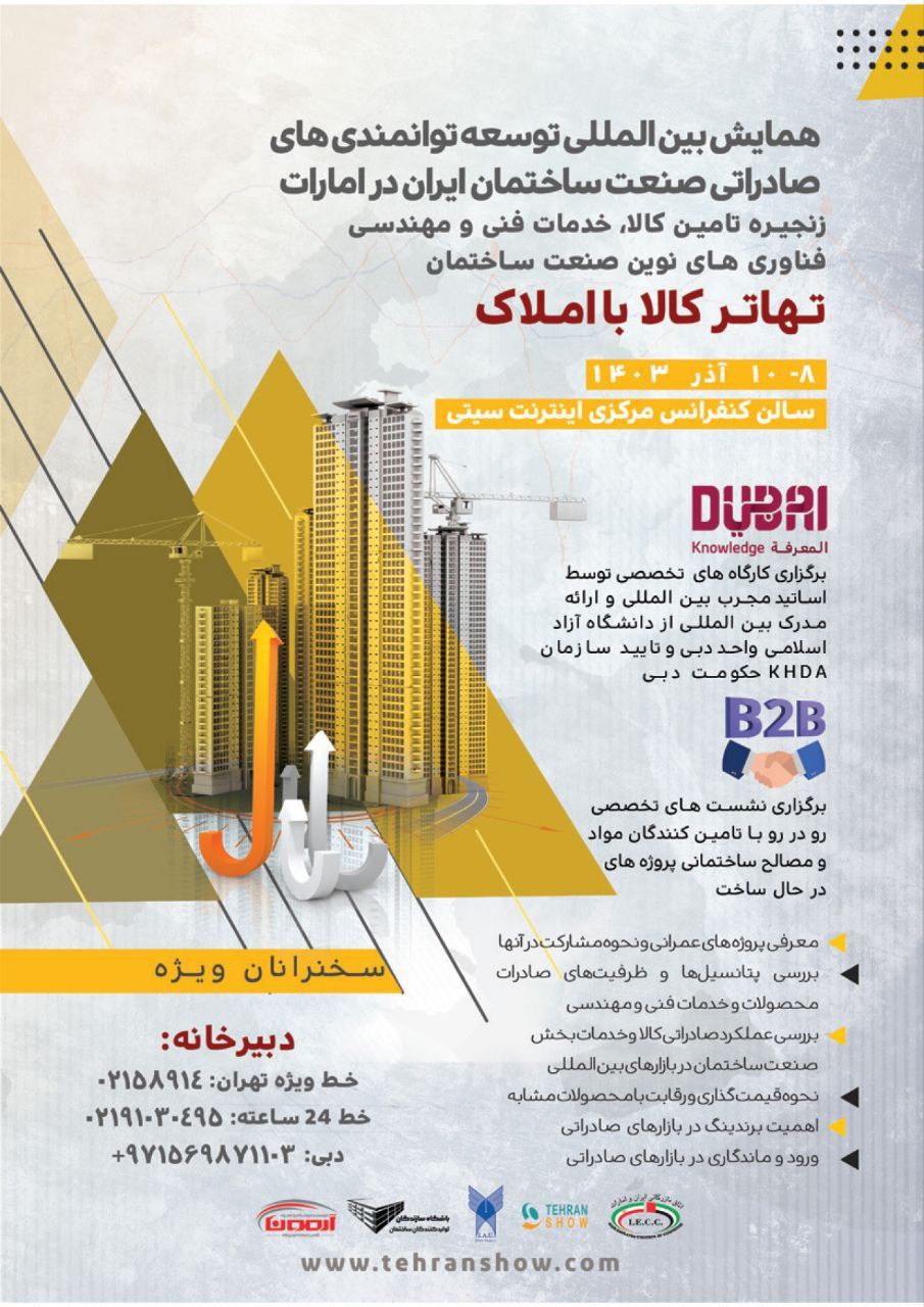 اعزام هیأت تجاری نمایشگاه BIG 5 دبی در تاریخ 6 الی 9 آذر ماه و همزمان با همایش بین المللی توسعه توانمندی های صادراتی صنعت ساختمان ایران در امارات، زنجیره تامین کالا، خدمات فنی و مهندسی، فناوری های نوین در صنعت ساختمان و همچنین تهاتر کالا با ملک در تاریخ 8 الی 10 آذر ماه 1403 در سالن کنفرانس مرکزی اینترنت سیتی برگزار میگردد. از علاقمندان دعوت میگردد جهت کسب اطلاعات بیشتر و ثبتنام فایل پیوست را ملاحظه فرمایید.