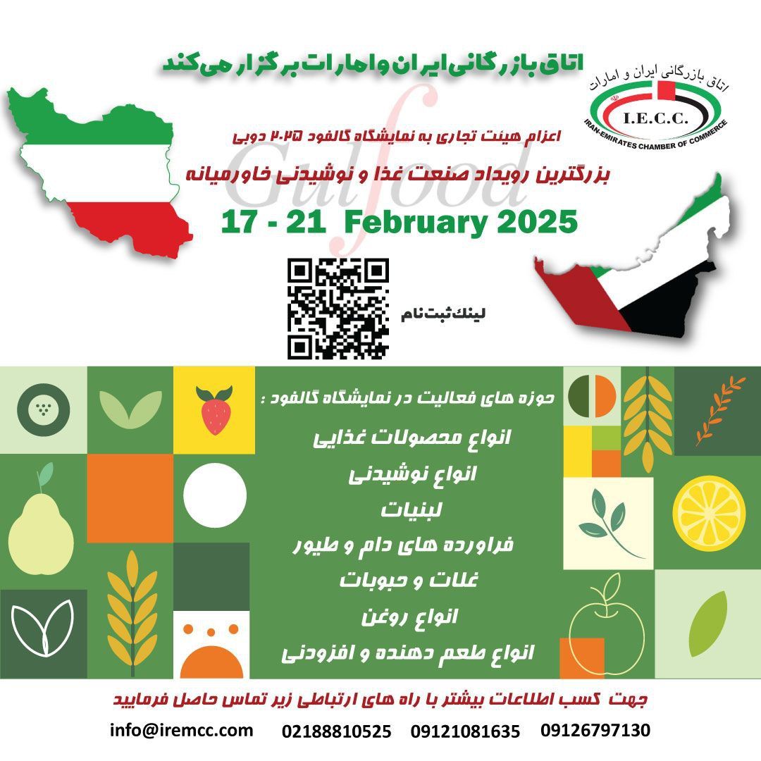 دعوت به عمل می آورد جهت حضور در هیات مذکور و بازدید از نمایشگاه گالفود ۲۰۲۵ دبی مورخ ۲۹ بهمن الی ۳ اسفند از طریق لینک https://survey.porsline.ir/s/QfqDhPRI و یا راههای ارتباطی مندرج در پوستر اقدام فرمایند.